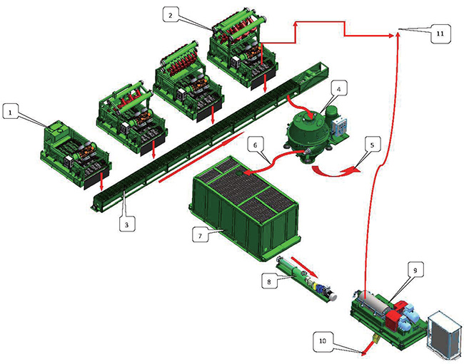 鉆井泥漿不落地處理工作流程說明如下:鉆機過來的泥漿通過高架管匯進(jìn)入振動篩(1)、清潔器(2),經(jīng)過(1)、(2) 處理排放的鉆屑通過螺旋輸送器(3)輸送至立式甩干機處理(4)。立式甩干機處理完的固體通過廢渣(5) 排除,回收到的鉆井泥漿(6)進(jìn)入鉆井液泥漿罐體(7),離心機供液泵或螺桿泵(8)抽取含有細(xì)固 顆粒的回收泥漿,供給離心機(9 )處理,固體部分通過固體排渣口(10)排除,處理完成的鉆井液通 過干凈泥漿回歸泥漿系統(tǒng)(11)。