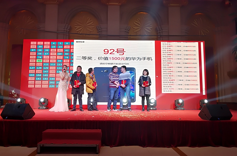 在總經(jīng)理的帶領(lǐng)下,冠能公司很多同事成了“花粉”,也就是華為的粉絲。2017年年會(huì)主題,就是借用的華為公司任總的話“不破樓蘭終不還”。我們也一直弘揚(yáng)類似華為的奮斗者文化,讓跟隨公司共同奮斗發(fā)展的員工,有一個(gè)獲得認(rèn)可的回報(bào)。奮斗者不一定成功,但成功者必定奮斗過,我們將繼續(xù)努力奮斗。在這幾年年會(huì)里,用于抽獎(jiǎng)的獎(jiǎng)品大部分都是華為產(chǎn)品。今年特等獎(jiǎng)是5臺(tái)彩色電視機(jī),一等獎(jiǎng)是10臺(tái)華為PAD,二等獎(jiǎng)是20臺(tái)華為手機(jī),三等獎(jiǎng)是40臺(tái)華為手環(huán),四等獎(jiǎng)是60臺(tái)美的電火鍋。共計(jì)獎(jiǎng)品135臺(tái)。在此,再次恭喜得獎(jiǎng)的幸運(yùn)朋友。