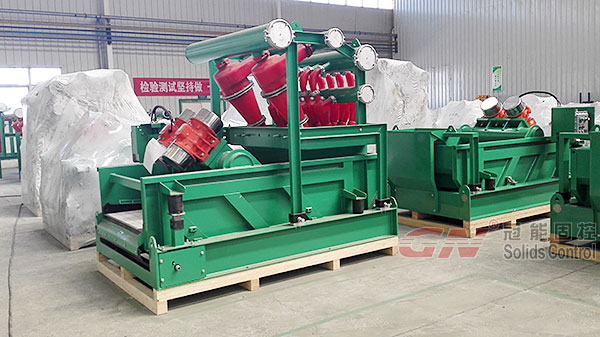 3 臺GNZS594J-2S12N泥漿清潔器。 冠能的除砂除泥一體機(jī)是由兩個十英寸的除砂旋流器、十二個四英寸的除泥旋流器和一臺GNZS594底流篩組成。這款泥漿清潔器的工作性能比不配備底流篩的單獨(dú)除砂器、除泥器處理效果好。