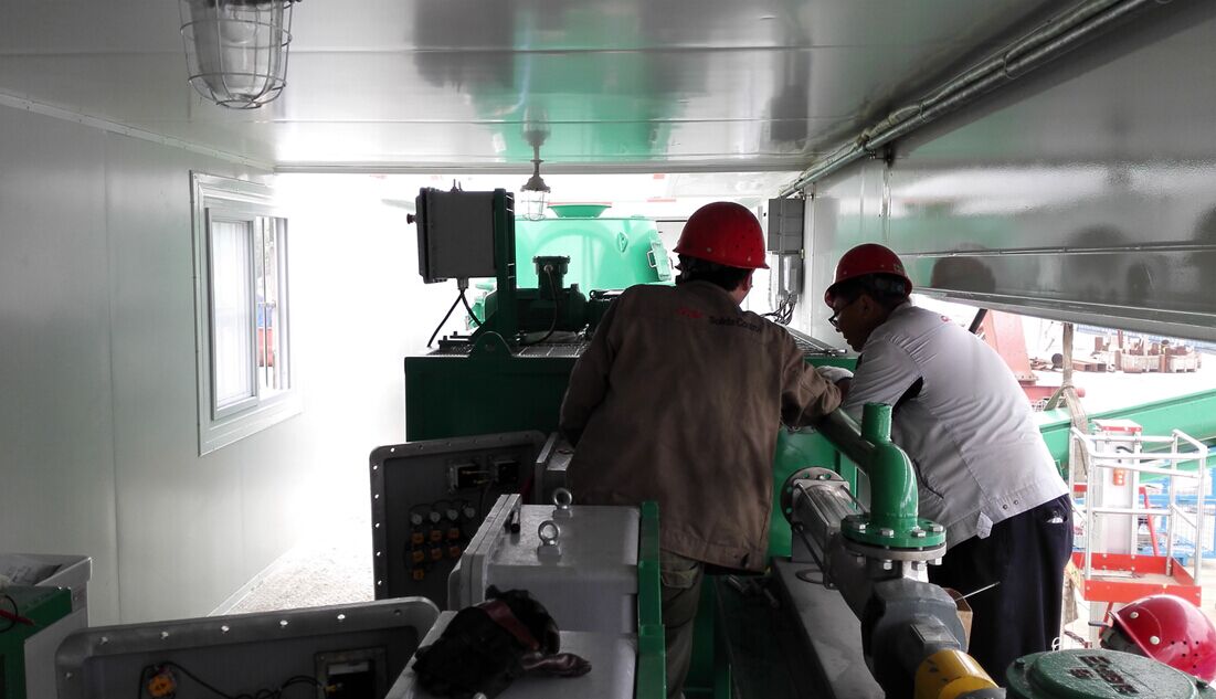 - 兩臺(tái)臥螺離心機(jī),采用一臺(tái)定速、一臺(tái)變頻,這兩臺(tái)泥漿離心機(jī)的布局設(shè)計(jì)合理緊湊,用于處理鉆屑甩干機(jī)處理后的液相部分,處理后的液相部分達(dá)到客戶的的處理要求。